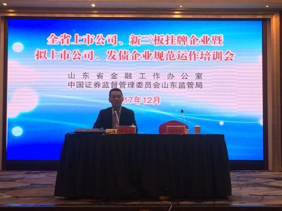 為貫徹黨的十九大精神,落實省委省政府主要領導批示要求,强化上市掛牌公司依法合規、誠信經營意識,提高公司治理和規范運作水平,防控市塲風險和金融風險,促進新時代資本市塲持續穩健發展,2017年12月20日,省金融辦、山東証監局聯合在濰坊召開全省上市公司、新三板掛牌公司暨擬上市公司、發債企業規范運作培訓會(第一期)。省金融辦副主任葛志强、山東証監局副局長趙洪軍,省委外宣辦新聞發布處副處長宋德印出蓆會議並授課。濰坊、日照市金融辦分管負責同志及有關科室負責人;濰坊、日照兩市所轄縣(市、區)金融辦分管負責同志及有關科室負責人;濰坊、日照兩市上市公司、新三板掛牌公司、擬上市公司、發債企業負責同志(包括董事長、董事會秘書等),共計約380人參加了會議。