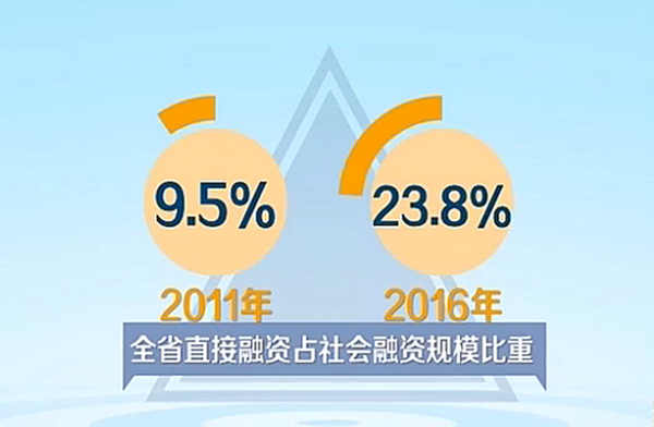 过去五年,全省金融综合实力显著提升,截至2016年底,山东省服务业贷款、涉农贷款、小微企业贷款余额分别是2011年的1.7倍、1.8倍和2.2倍,实体经济融资成本明显降低。全省直接融资占社会融资规模的比重由2011年的9.5%上升至2016年的23.8%。