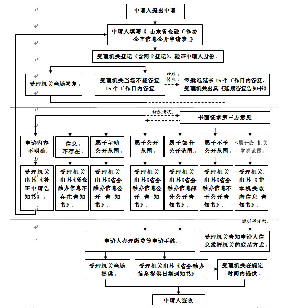 办理申请人省金融工作办信息公开申请时,能够立即答复的,将立即答复;不能立即答复的,自收到申请之日起15个工作日内予以答复;确需延长答复期限的,延长答复时间不超过15个工作日,并告知申请人。省金融工作办信息涉及第三方权益的,应当征求第三方的意见,征求第三方意见所需时间不计算在期限内。